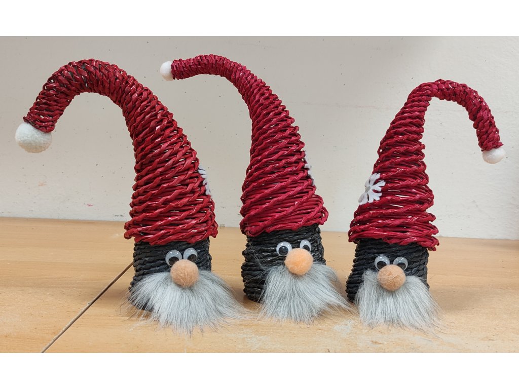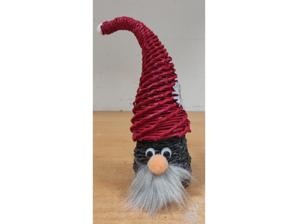 Ručně pletený výrobek z papírového pedigu, Zdobený dekorací. Barva hnědá bílá červená. Výška 23cm.