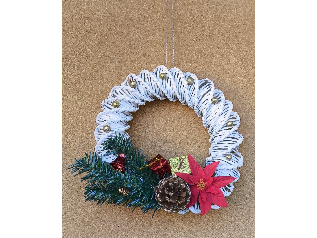 Ručně pletený výrobek z papírového pedigu, Zdobený vánoční dekorací. Barva bílá. Průměr 30cm