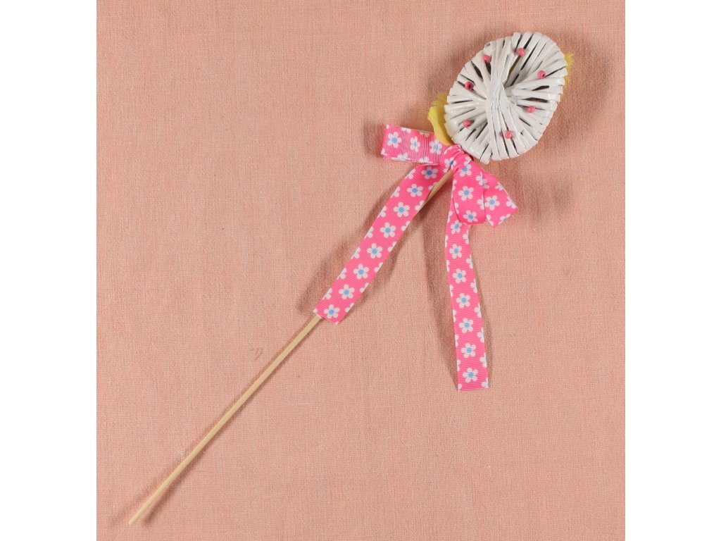 Ručně pletený výrobek z papírového pedigu, Zdobený velikonoční dekorací. Barva bílá. Výška 10cm.